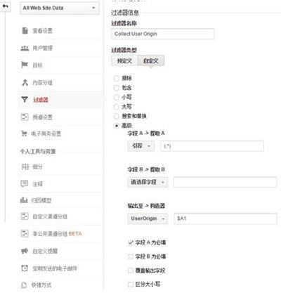 高級過濾器可以讓你免去寫JavaScript的麻煩,我們通過這個例子來介紹。同樣在管理>查看>過濾器中建立一個叫做Collect User Origin的高級過濾器。具體設(shè)置如下: