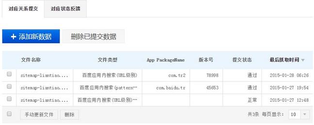 您需要在應(yīng)用內(nèi)搜索的提交狀態(tài)查詢頁面點擊“刪除已提交數(shù)據(jù)”按鈕,進(jìn)入刪除已提交數(shù)據(jù)頁面進(jìn)行數(shù)據(jù)的刪除操作。直接在已提交的xml地址中刪除指定對應(yīng)關(guān)系并不會成功刪除,只是停止更新。