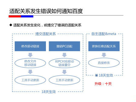 目前通過百度站長平臺進(jìn)行移動適配關(guān)系提交是大家選擇較多、也是效果最理想的方式。如果適配關(guān)系發(fā)生變化,除了修改適配文件外,記得一定要通過開放適配工具進(jìn)行文件手動更新。