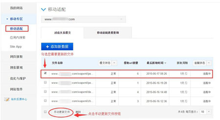 通過開放適配工具提交的適配關(guān)系文件都在自己的網(wǎng)站上,我們需要找到記錄該適配關(guān)系的文件,將變更后的新規(guī)則覆蓋舊規(guī)則,然后到百度站長平臺的開放適配工具內(nèi),點選該文件,進(jìn)行“手動更新文件”即可完成變更操作。一般情況下18天以內(nèi)就可以生效(后續(xù)會縮短到10天。