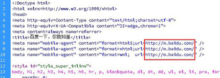 META標(biāo)記這種適配方式也有不少的同學(xué)在操作,前提是你的頁面進(jìn)行了META標(biāo)記后必須被蜘蛛抓取識別后才能生效。一般情況下META標(biāo)記這種我們只要修改下新的路徑即可,如下圖只要在頁面內(nèi)把畫紅框部分的URL進(jìn)行變更即可,為了能夠更快的生效我建議在變更后使用sitemap等方式提交該類頁面,讓百度能夠更快的發(fā)現(xiàn)和更正適配關(guān)系。