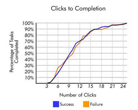 為了完成任務(wù),一些用戶訪問(wèn)多達(dá)25頁(yè)之前他們結(jié)束了他們的任務(wù)和其他只去過(guò)兩三頁(yè)之前停止。如果設(shè)定“三次點(diǎn)擊”的原則來(lái)自數(shù)據(jù),我們肯定會(huì)看到這個(gè)頁(yè)面訪問(wèn)的數(shù)量差異很大。當(dāng)我們研究數(shù)據(jù),告訴我們我們應(yīng)該看到用戶送達(dá)到第三頁(yè)后,離開之前,他們有機(jī)會(huì)成功。這些任務(wù)多達(dá)25點(diǎn)擊會(huì)成功,大多數(shù)成功的任務(wù)落在了某個(gè)地方,接近三點(diǎn)擊長(zhǎng)度。