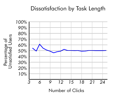 如果我們看的任務(wù)大大超過(guò)三次點(diǎn)擊,我們看到用戶的滿意度下降了嗎?結(jié)束時(shí)的620個(gè)任務(wù),我們要求用戶如何滿足他們的網(wǎng)站的任務(wù)。再次,有各種各樣的答案,有時(shí)用戶非常滿意,其他時(shí)候他們完全不滿意。這些評(píng)級(jí)與點(diǎn)擊的數(shù)量了嗎?分析滿意度的數(shù)據(jù)后,我們?nèi)匀粵](méi)有發(fā)現(xiàn)證據(jù)的設(shè)定“三次點(diǎn)擊”的原則。當(dāng)我們看著用戶不滿意的比例,我們的數(shù)據(jù)顯示幾乎沒(méi)有變化之間不同的點(diǎn)擊流長(zhǎng)度。更少的點(diǎn)擊不讓用戶更滿意。