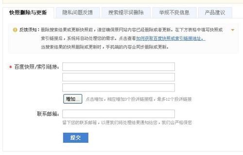 從百度上檢索快照的投訴地址為http://tousu.baidu.com/webmaster/add,一般來說這里需要我們提前來獲取要投訴的快照的地址,然后復(fù)制到到索引鏈接中進(jìn)行提交。如圖: