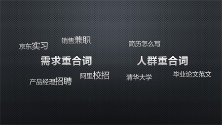 (1)需求重合 對(duì)于實(shí)習(xí)僧,如“京東實(shí)習(xí)”、“阿里校招”、“銷售兼職”一類即為需求高度重合的詞;同時(shí),值得注意的是,如單獨(dú)的公司名字,也是需求部分重合的詞,因?yàn)橛性S多求職者通過直接搜索公司名字來了解公司情況。