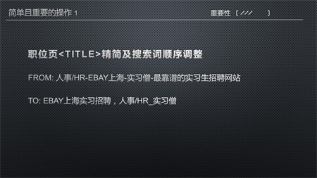 差異性強(qiáng)的屬性,主要是公司名稱,其次再是職位及行業(yè)詞等,因此按公司名稱、職位這樣的順序去寫<title>。根據(jù)經(jīng)驗(yàn),諸如將公司名稱寫到<title>左側(cè)這樣的改動(dòng),盡管改動(dòng)非常小,但往往能提高該類頁面至少10%的SEO流量。