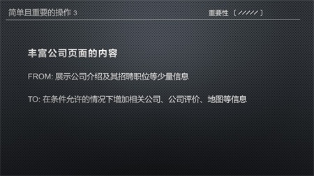 對(duì)于公司介紹頁面,可添加的較重要的信息如:相關(guān)公司、公司評(píng)價(jià)……相對(duì)次要的信息如:公司具體地址及對(duì)應(yīng)地圖、平均薪資……