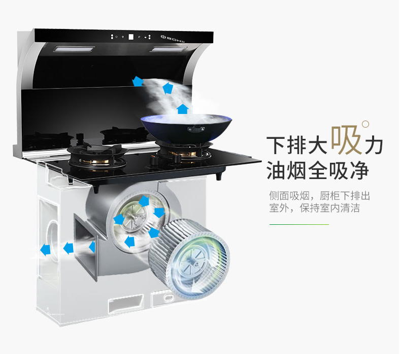 1.博凈分體式集成灶的吸油率比抽油煙機(jī)高,排煙效果更徹底