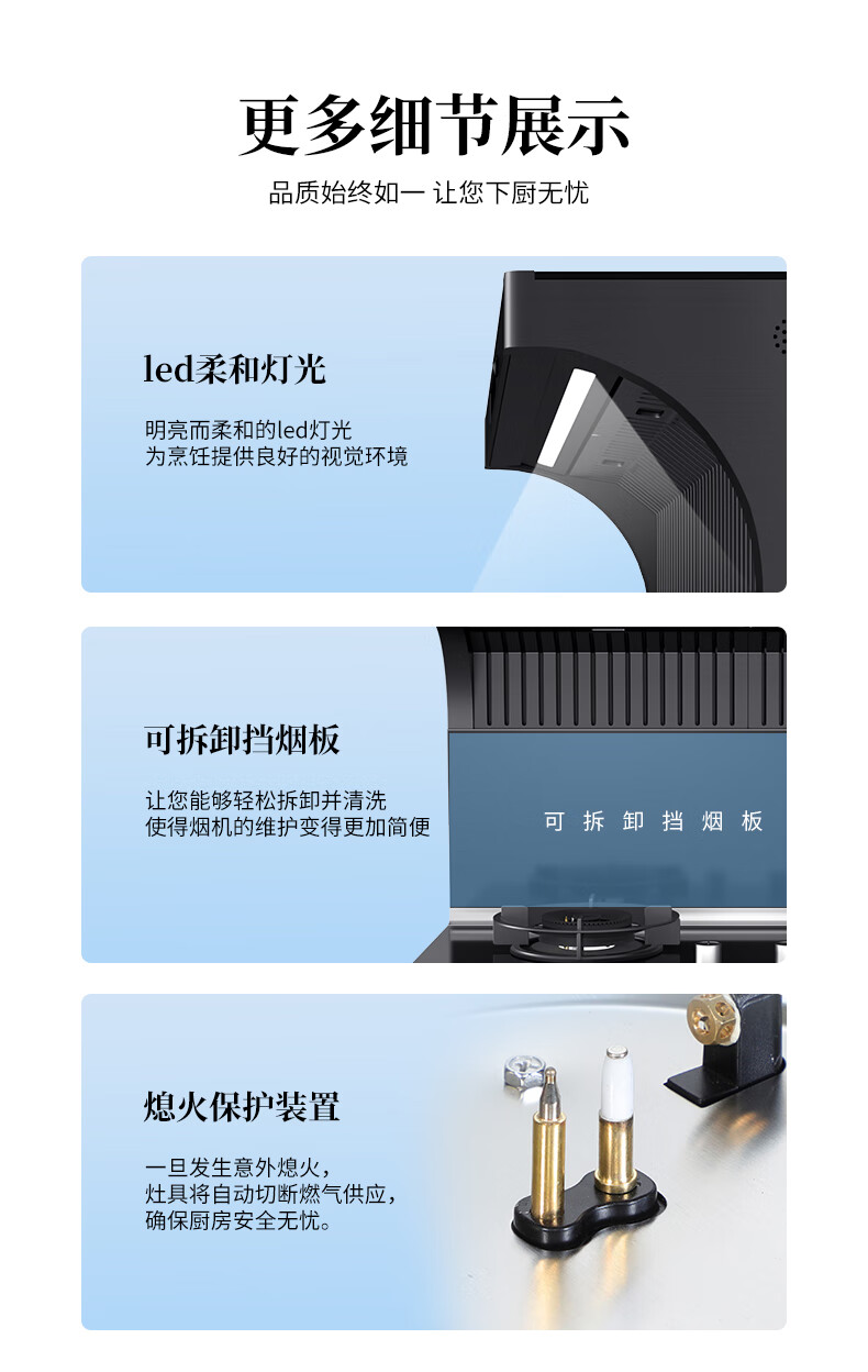 明亮而柔和的LED燈光,為烹飪提供良好的視覺(jué)環(huán)境,可拆卸擋煙板讓你能夠輕松拆卸并清洗,使得煙機(jī)的維護(hù)變得更加簡(jiǎn)便,熄火保護(hù)裝置,一旦發(fā)生意外熄火,灶具將自動(dòng)切斷燃?xì)夤?yīng),確保廚房安全無(wú)憂。