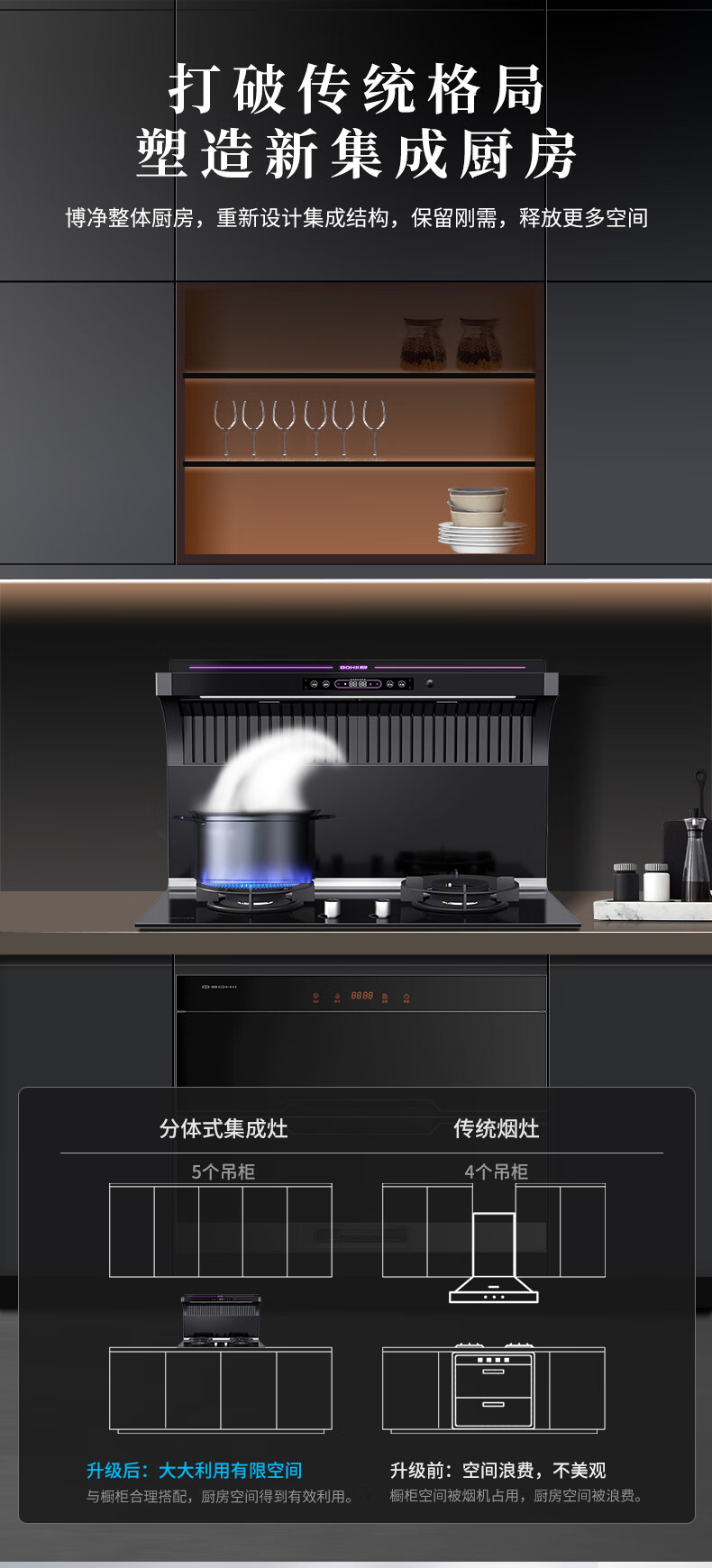 博凈分體式集成灶,集功能和顏值于一體的智慧廚房電器,提高廚房空間和品質(zhì)!