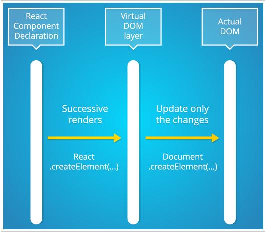 你可以找到更詳細比較角與反應皮特·亨特(在Facebook工作/ Instagram)。反應快采用不同的方法反應DOM相比其他框架。它不會讓你直接使用DOM。它引入了一個層,稱為虛擬DOM,您的JavaScript邏輯與實際的DOM。