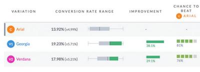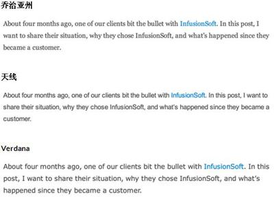 1、試驗的字體。嘗試字體時,第一個問題我想答案是該字體是最適合我們的網(wǎng)站?我跑一個初始分割測試我們的一個文章我測試了三種不同的字體的地方:格魯吉亞、Arial和Verdana。我們測量了每個字體的性能通過點(diǎn)擊文章的數(shù)量,結(jié)合跳出率和time-on-page行為指標(biāo)。這里有字體的文本塊段我們測試,這樣你可以得到一個視覺知道我們測試的變體。